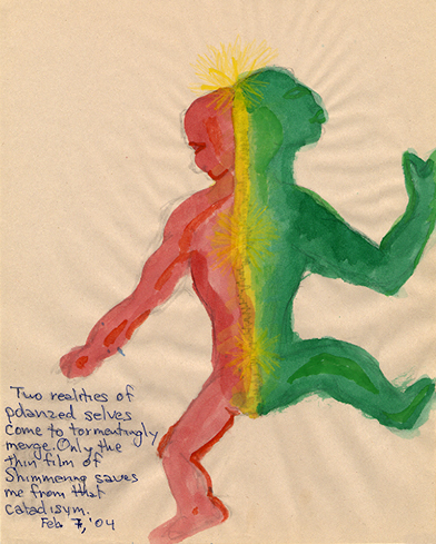 Yet, because of the great disparity between our realities, with this shifting back and forth, there is often conflict, if not torment between us. This unthinkable desperation creates the need and welcoming for the Shimmering from both "me's". The Shimmering's presence evokes a call to devotion and the deeper release It brings frees and opens me to fuller inner aliveness.